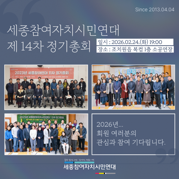회원 여러분~~ 안녕하세요? 2026년 세종참여자치시민연대 제14차 정기총회 안내드립니다.* 총회 일시 : 2026. 02. 24(화) 저녁 7시* 총회 장소 : 조치원읍 복...