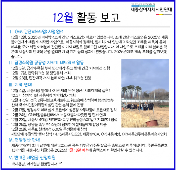 회원여러분, 안녕하세요? 세종참여연대 2025년 12월, 마지막 활동보고 드립니다.