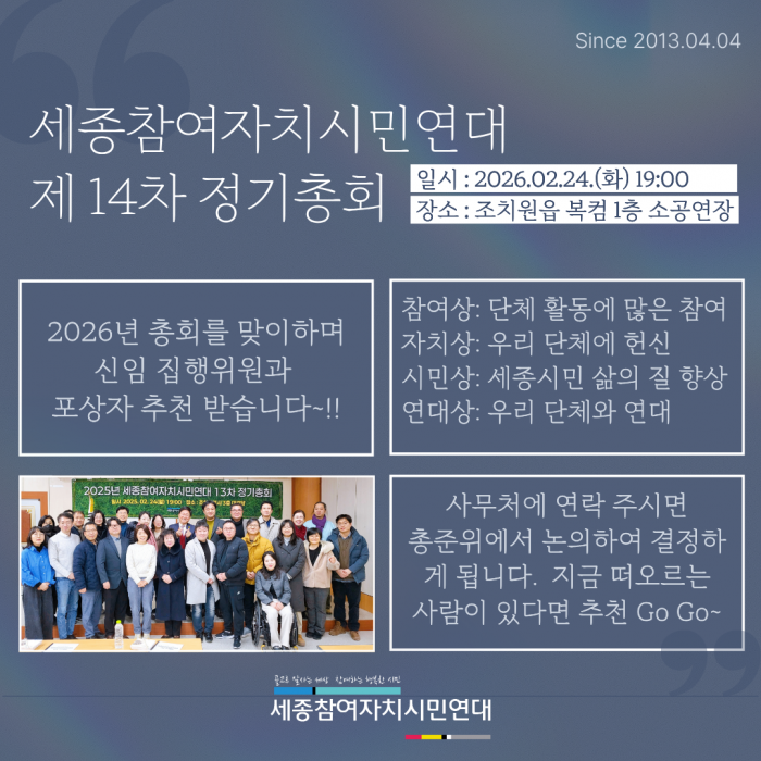 2026년 세종참여자치시민연대 제14차 정기총회 안내드립니다.